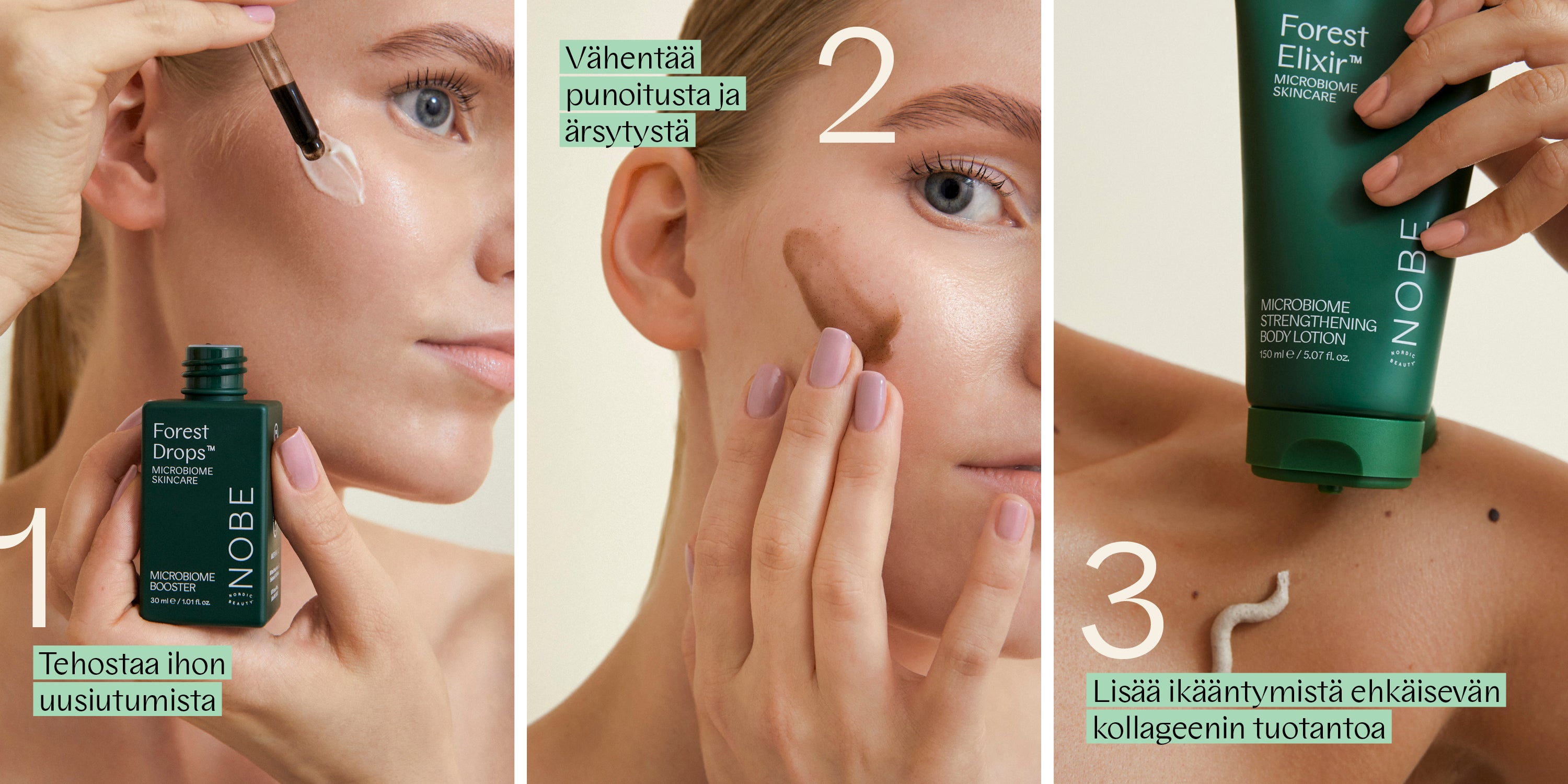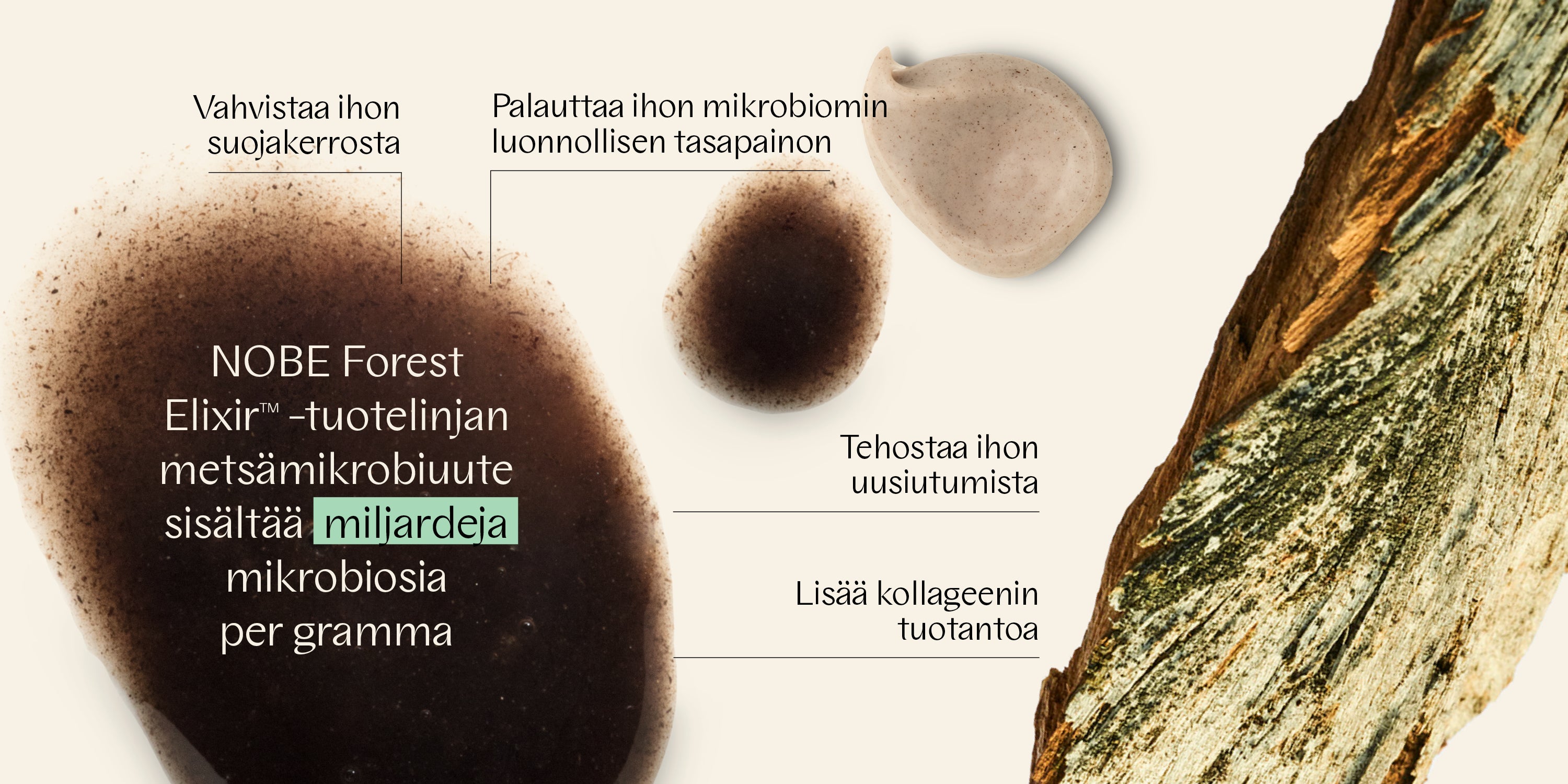 Ihon suojakerrosta vahvistava metsäkylpy urbaanille ihmiselle. NOBE Forest Elixir®, Microbiome Skincare -sarjan aktiivisena raaka-aineena on suomalaisen Uute Scientificin tuottama Re-Connecting Nature® -metsämikrobiuute. Pohjolan metsistä saatavan raaka-aineen on tieteellisesti todistettu palauttavan ihon mikrobiomin luonnollisen tasapainon, vahvistavan ihon suojakerrosta ja tehostavan ihon uusiutumista. Tuloksena on hyvinvoiva, tasapainoinen ja kuulas iho.