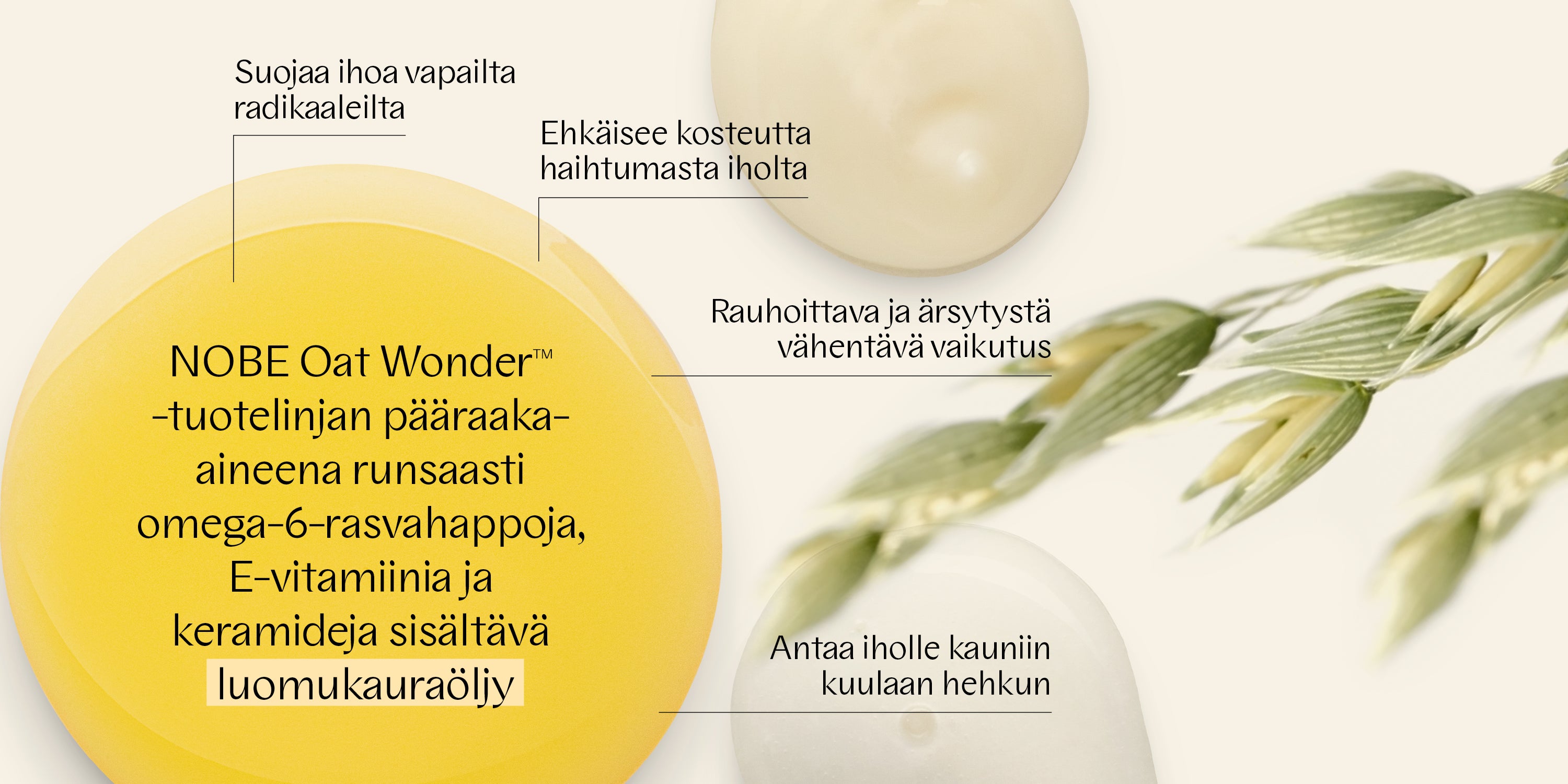 Ravitse ja helli ihoa ylellisellä luomukauraöljyllä. NOBE Oat Wonder®, Superfood Skincare -sarjan tuotteet sisältävät yhdistelmän omega-6 -rasvahappoja, E-vitamiinia sekä keramideja, jotka ravitsevat, suojaavat ja vahvistavat ihoa. Sarjan pääraaka-aineena on Fazer Foodtechin tuottama, superfoodina tunnettu FAZER OAT OIL, joka korjaa ihoa tehden siitä samettisen pehmeän ja kimmoisan.